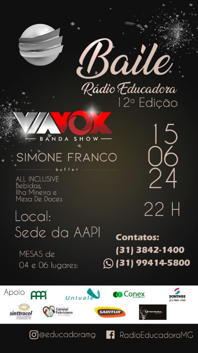 A Rádio Educadora Vale do Aço, localizada no Centro de Cel. Fabriciano, realiza no sábado (15), a partir  das 22h, no Clube dos Pioneiros na Associação dos Aposentados e Pensionistas de Ipatinga (AAPI), a 12ª edição de seu já tradicional baile, para marcar as comemorações dos 56 anos da emissora pioneira da região. Desta vez, o evento vem recheado de novidades, pois além da apresentação da banda ViaVox, muita comida, bebida e boa conversa e diversão, haverá também um momento de homenagens especiais para profissionais, autoridades e empresários do Vale do Aço que contribuíram para o desenvolvimento da regional. Ainda durante o baile, serão anunciados os detalhes da mudança da tão sonhada migração da AM 1010 para o FM 91,7, além de uma modernização da 107,1 FM que conta com uma programação de altíssima qualidade musical.