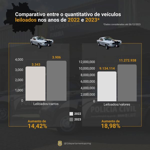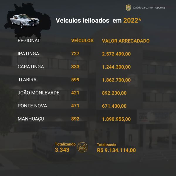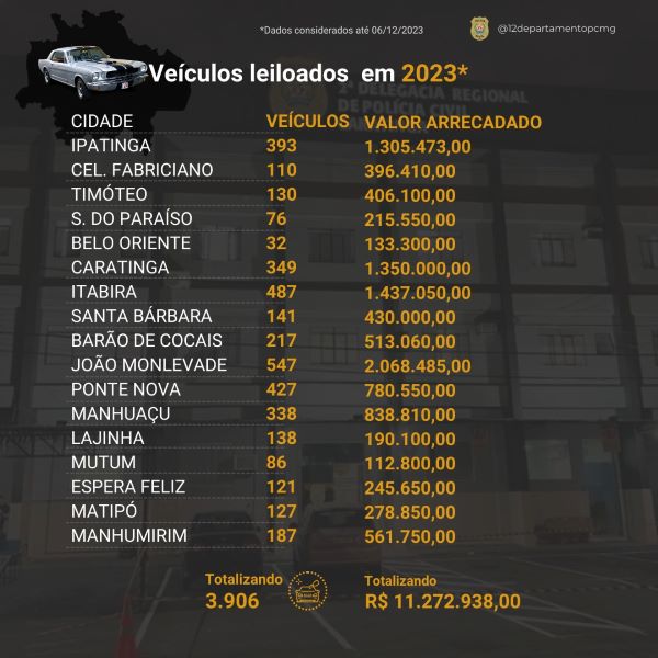 Conforme divulgado pelo 12º Departamento de Polícia de Ipatinga, que presta serviços à sociedade, foram apresentados os dados referentes ao quantitativo de veículos leiloados em 2023, assim como os valores arrecadados.