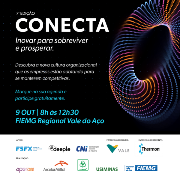 O Conecta 2024 é uma realização da FIEMG Regional Vale do Aço, ArcelorMittal Monlevade, Aperam, Cenibra e Usiminas; com Apoio da Confederação Nacional das Indústrias (CNI), Fundação São Francisco Xavier (FSFX), Deeple e Patrocínio da Vale e Thermon.