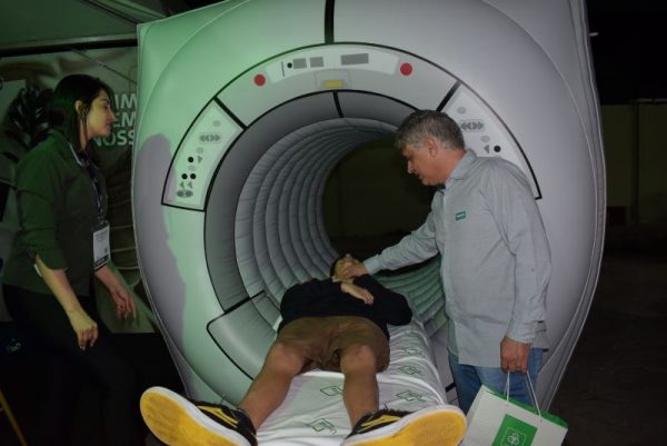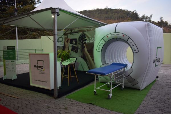 A Unimag também marcou presença na feira de negócios com um stand próprio. A clínica de diagnóstico por imagem, que é referência em nossa região, levou uma réplica inflável de uma ressonância magnética, permitindo que os visitantes simulassem a realização do exame. Além disso, fotos polaroid tiradas na hora, reforçando o compromisso da empresa com a agilidade na realização de seus exames, foram entregues como brinde.