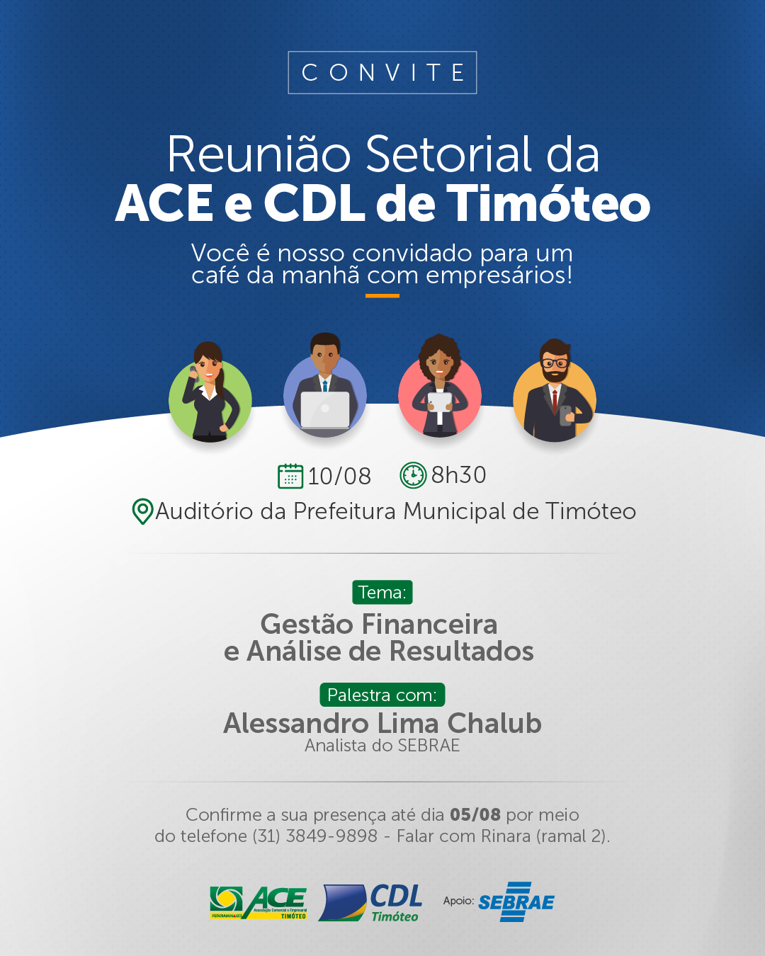 Para estar mais próxima dos associados, a ACE e CDL realizam a I Reunião Setorial – Café da Manhã com os Empresários, no dia 10/08, às 8h30, no auditório da Prefeitura Municipal de Timóteo. Na oportunidade, será realizada uma palestra com o Analista do Sebrae, Alessandro Lima Chalub, sobre Gestão Financeira e Análise de Resultados.
