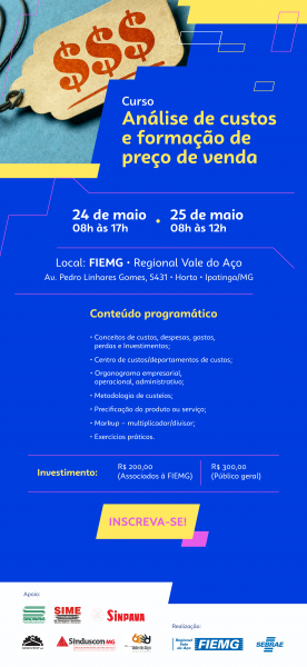 A FIEMG Regional Vale do Aço, em parceria com o SEBRAE MG, realizará nos dias 24 e 25/5, das 8h às 17h/ 8h às 12h, no auditório da FIEMG, em Ipatinga, o curso Análise de custos e formação de preço de vendas.