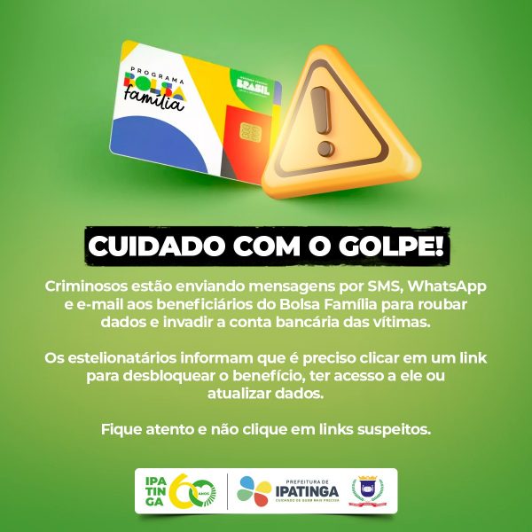 A administração de Ipatinga, por meio da Secretaria Municipal de Assistência Social (SMAS), lançou um alerta à população nesta quarta-feira (29) sobre uma modalidade de golpe que tem sido aplicada por criminosos, tendo como alvo os beneficiários do Bolsa Família, programa do Governo Federal de transferência de renda.