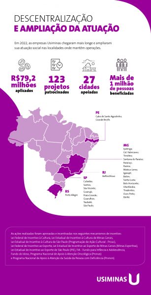 A diretora corporativa de Comunicação e Responsabilidade Social, Ana Gabriela Dias Cardoso, comemora os resultados do ano e enfatiza a importância desse trabalho. “A Usiminas, desde a sua fundação, é uma empresa muito presente e atuante nas comunidades. Em 2022, ano em que comemoramos os 60 anos de operações da Usiminas, pudemos estreitar ainda mais os laços, desenvolver iniciativas estruturantes e perenes e nos conectar de forma direta com projetos relevantes para o desenvolvimento das pessoas e dos territórios onde estamos presentes”, salienta.