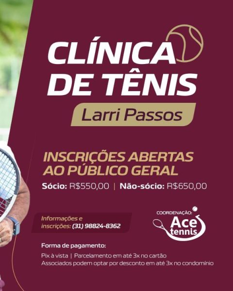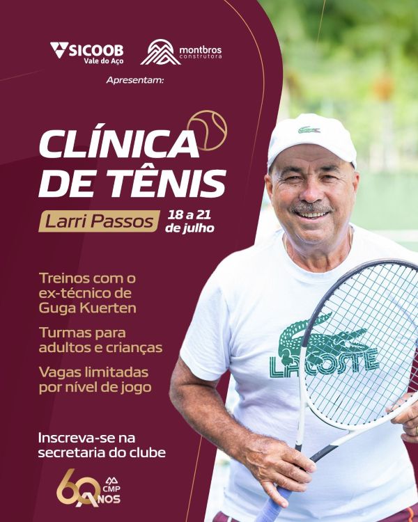 O Clube Morro do Pilar, em Ipatinga, MG, tem a honra de anunciar uma clínica de tênis exclusiva com o renomado treinador Larri Passos, mentor do lendário Gustavo Kuerten! De 18 a 21 de julho, jogadores de todas as idades e níveis (sócios e não sócios) terão a chance de aprender com um dos melhores treinadores do esporte.