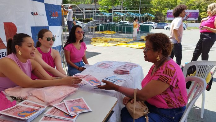 As integrantes do Conselho e da OAB distribuíram alguns exemplares do Guia da Mulher e do Violentômetro para os pedestres e motoristas no centro Norte.