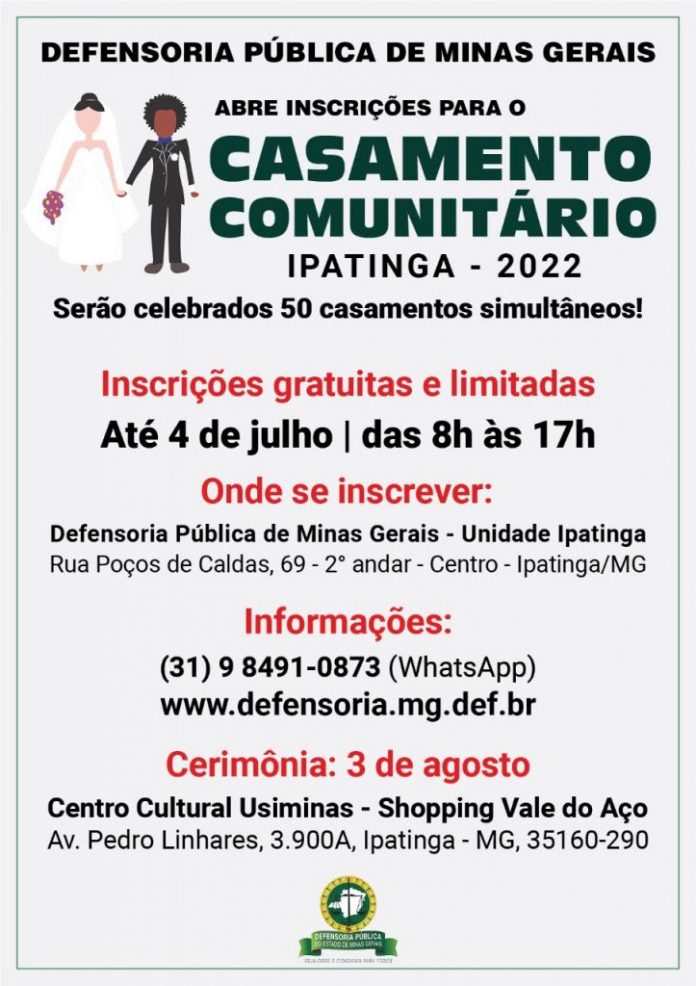 A Defensoria Pública de Minas Gerais (DPMG) abre inscrições para o Casamento Comunitário que a Instituição promoverá em Ipatinga, no Vale do Aço, região leste do estado.