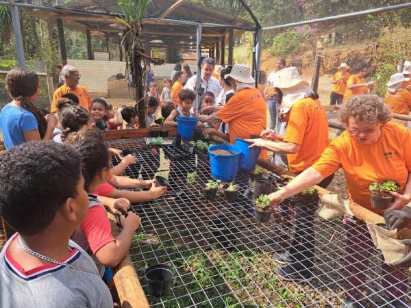 Crianças e idosos trocam experiências sobre plantio de mudas e preservação de florestas durante visitas ao Centro de Educação Ambiental da Aperam