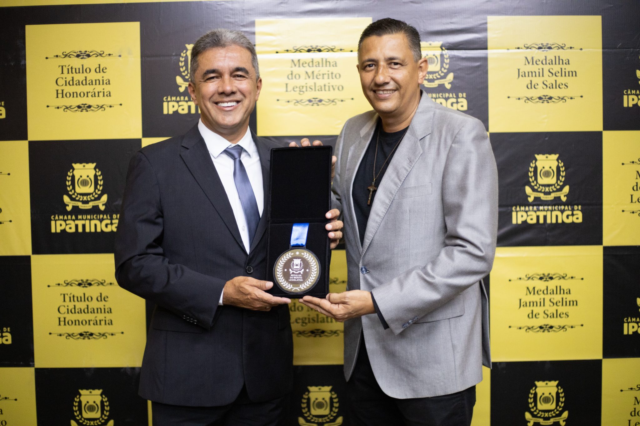 O diretor-presidente do Grupo WR, Wallace Barreto Simão, com a presença da esposa Rosana Simão, recebeu da Câmara de Ipatinga a Medalha do Mérito Legislativo. A entrega foi realizada nesta terça (29), durante a Sessão Solene da Câmara no Teatro do Centro Cultural Usiminas.