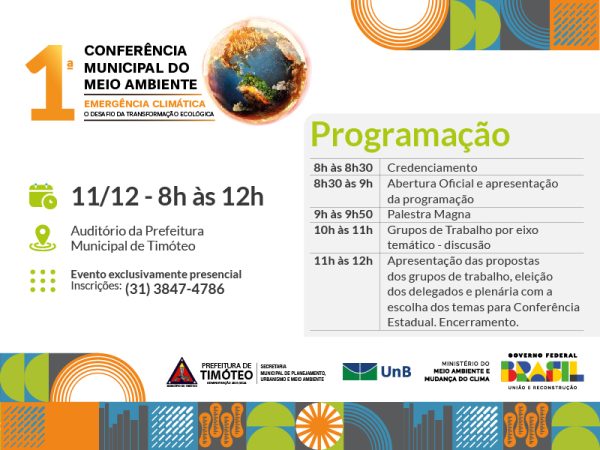 “Promover o debate sobre a Emergência Climática para subsidiar a implementação da Política Nacional sobre Mudança do Clima” é o tema da 1ª Conferência Municipal do Meio Ambiente de Timóteo agendado para ocorrer entre 8h e 12h do dia 11 de dezembro no Auditório da Prefeitura Municipal de Timóteo. Na oportunidade está prevista a eleição dos delegados que representarão o município na 5ª conferência Estadual do Meio Ambiente de Minas.