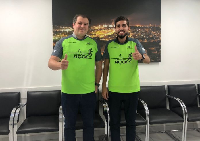 Na tarde desta quinta-feira (20), representantes da Usiminas, do Instituto Usiminas, do Instituto Brasil Igualdade Social (IBIS) e da Associação de Cultura e Esporte e Lazer Pace 3, fizeram uma entrega oficial de kits da 2ª Corrida do Aço para o prefeito de Ipatinga, Gustavo Nunes, e demais integrantes de sua equipe de governo. A Corrida do Aço é realizada pelo Instituto Brasil Igualdade Social (IBIS), em parceria com a Associação de Cultura e Esporte e Lazer Pace 3. O patrocínio é da Usiminas, por meio da Lei Estadual de Incentivo ao Esporte, com apoio do Instituto Usiminas, Usisaúde e Prefeitura Municipal de Ipatinga. Na foto, o diretor de Sustentabilidade e Relações Institucionais da Usiminas, André Chaves, e o prefeito Gustavo Nunes.