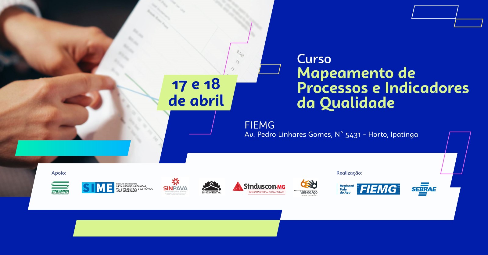 Nos dias 17 e 18 de Abril, a FIEMG Regional Vale do Aço e o SEBRAE Minas, promoverão o curso “Mapeamento de Processos e Indicadores da Qualidade”, das 8h às 17h/8h às 12h, na sede da FIEMG, em Ipatinga.
