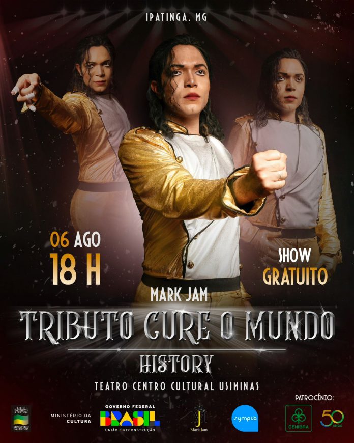 E no dia 06 de AGOSTO, o TEATRO USIMINAS em IPATINGA/MG, irá receber um SHOW INÉDITO !! Mark Jam e sua equipe irão enlouquecer o público com a estreia do “Tributo Cure o Mundo | History” !! Um show que irá representar uma das turnês mais icônicas de Michael Jackson.