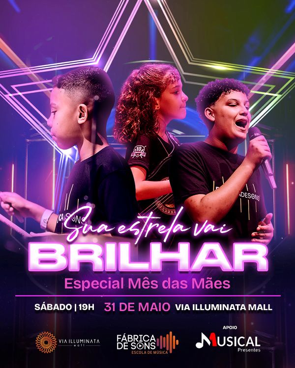 A Escola de Música Fábrica de Sons promove, no dia 31 de maio (sábado), às 19h, o espetáculo “Sua Estrela Vai Brilhar – Especial Mês das Mães”, em parceria com o Via Illuminata Mall, em Ipatinga (MG). O evento será realizado na praça de alimentação, com entrada gratuita e atrações para toda a família.