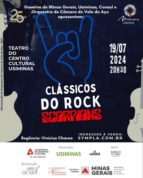Dia 19 de julho de 2024, próximo a data que se comemora o dia do rock, a Orquestra de Câmara do Vale do Aço surpreende mais uma vez com um repertório digno de parar a região para prestigiar. Serão orquestradas músicas da banda de rock alemã Scorpions, com canções memoráveis e verdadeiros hinos do rock, que trazem junto com suas músicas mensagens emblemáticas. Sob a regência do maestro Vinícius Saturnino Chaves, a orquestra apresentará alguns de seus maiores sucessos como “Send me an Angel”, “You and I”, “When the smoke is Going Down” entre outras canções da banda. Será mais uma noite de sucesso que o público de todas as idades poderá apreciar o melhor do Rock em uma roupa clássica como o público da região exige. Uma noite quente pra espantar o frio do inverno.