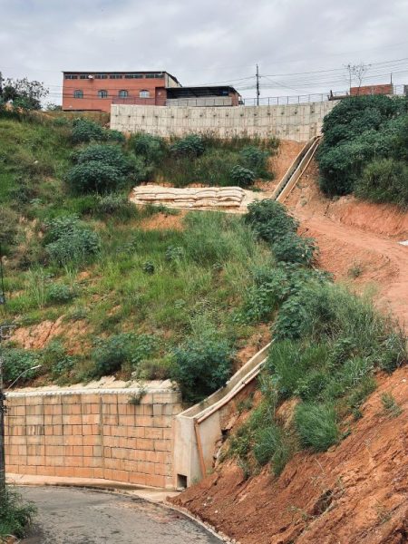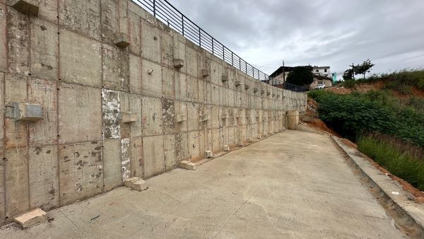 No local, foram executados 40 metros de cortina atirantada, uma moderna estrutura de contenção que garante maior estabilidade ao terreno. O sistema é apoiado por um muro modular em blocos de concreto, reforçando a base e prevenindo deslizamentos. Como parte do projeto, também foram realizados serviços essenciais, como aterro compactado, retaludamento das encostas, instalação de escada hidráulica para facilitar o acesso e canaletas de drenagem — ações fundamentais para o escoamento das águas pluviais e a prevenção de erosões.