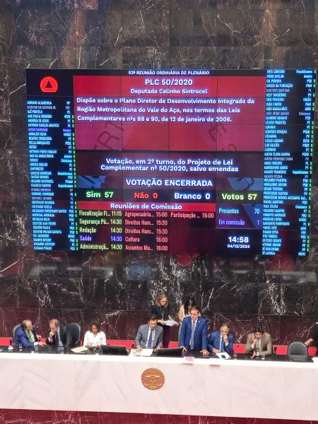 Um dia histórico para a Região Metropolitana do Vale do Aço. Na tarde desta quarta-feira, 4 de dezembro foi aprovado com 57 votos a favor e nenhum contra, o PLC50/2020 – Projeto de Lei Complementar, que dispõe sobre o Plano Diretor de Desenvolvimento Integrado da Região Metropolitana do Vale do Aço, que segue agora para sanção do Governador Romeu Zema.