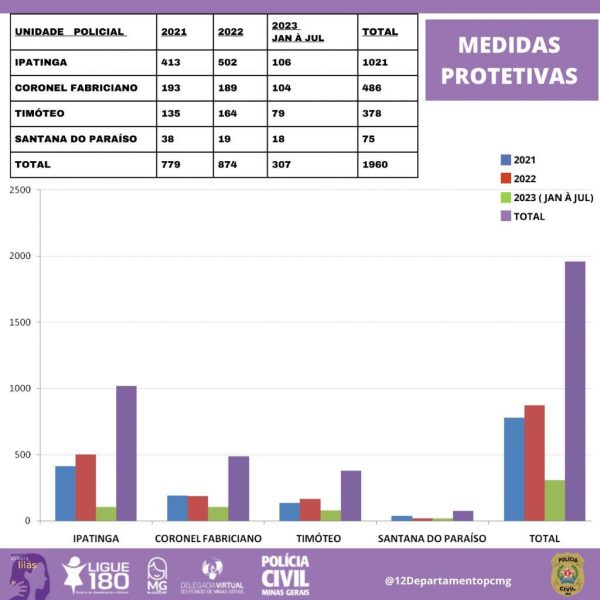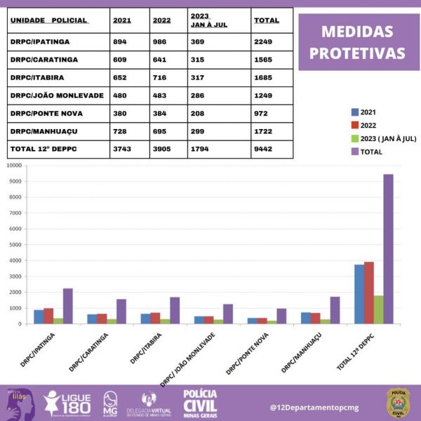 O 12º Departamento de Polícia Civil de Ipatinga divulgou nesta quinta-feira (31/8) o número de Medidas Protetivas requeridas pela Polícia Civil de Minas Gerais nas Unidades do 12º Departamento de Polícia Civil de Ipatinga (Ipatinga, Caratinga, Itabira, João Monlevade, Ponte Nova e Manhuaçu) nos anos de 2021, 2022 e de janeiro a julho de 2023.