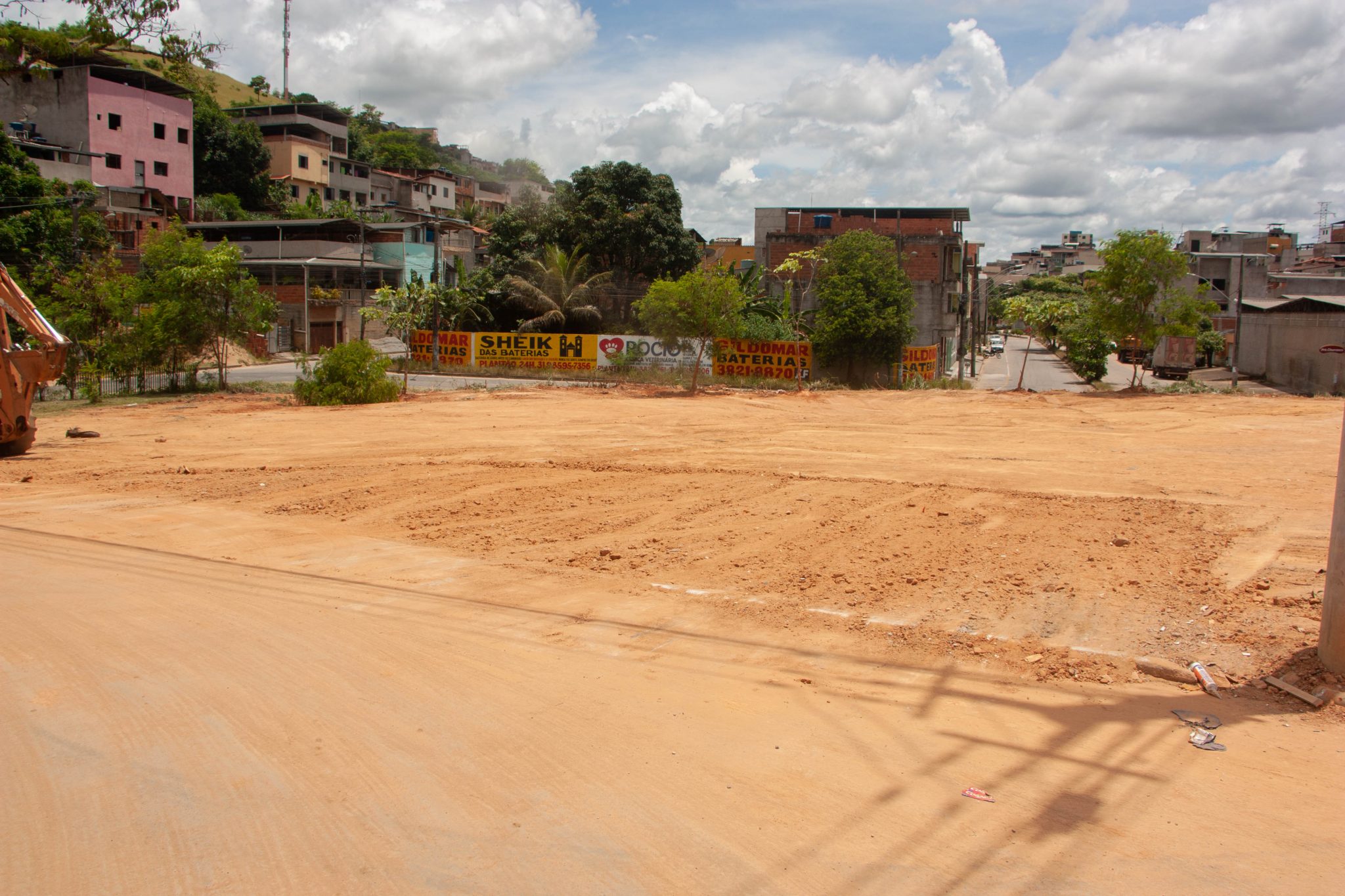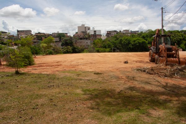 Homens e máquinas trabalham na limpeza e remoção de resíduos no terreno, que será gramado, receberá plantio de árvores e deve se transformar em centro de convivência da comunidade