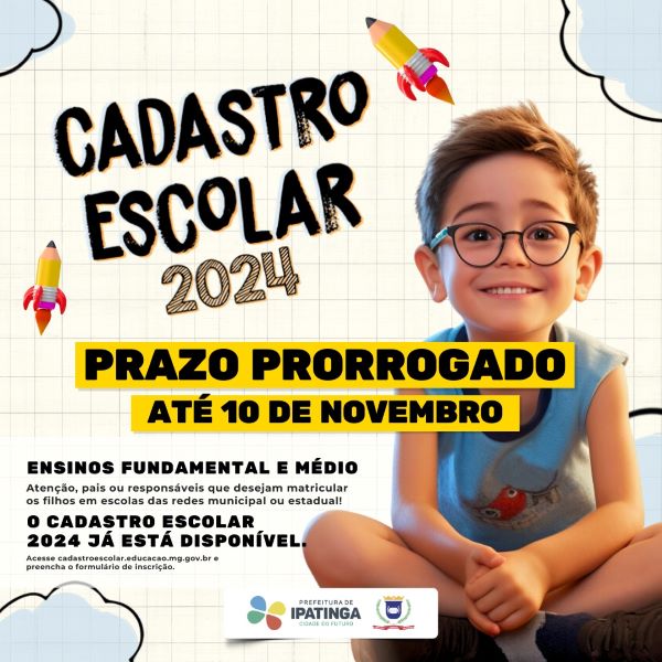 A Prefeitura de Ipatinga, por meio da Secretaria Municipal de Educação, informa que o Estado prorrogou o prazo do cadastro escolar para o ano letivo de 2024.