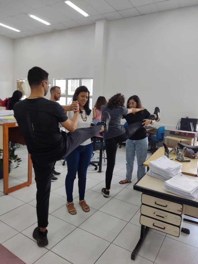 Além do material informativo, um educador físico tem percorrido as salas dos servidores e realizado alongamentos coletivos.