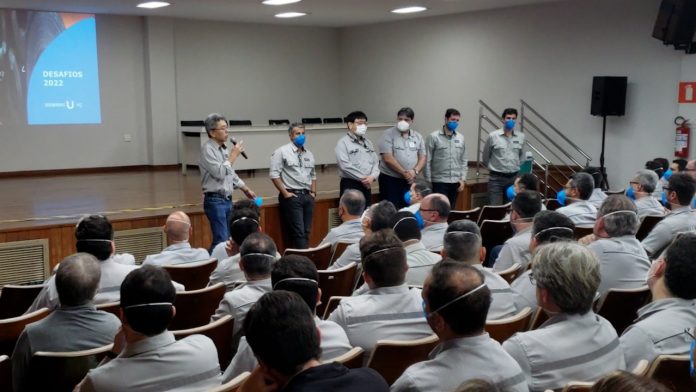 O presidente da Usiminas, Alberto Ono, esteve hoje na Usina de Ipatinga onde participou de um bate-papo com mais de 200 líderes da empresa. Em sua primeira visita como novo CEO da companhia, acompanhado de todos os vice-presidentes, Ono ressaltou o foco na geração de resultados para clientes, parceiros e comunidades, na agenda ESG e na busca por posicionar a empresa como uma referência operacional e em gestão.