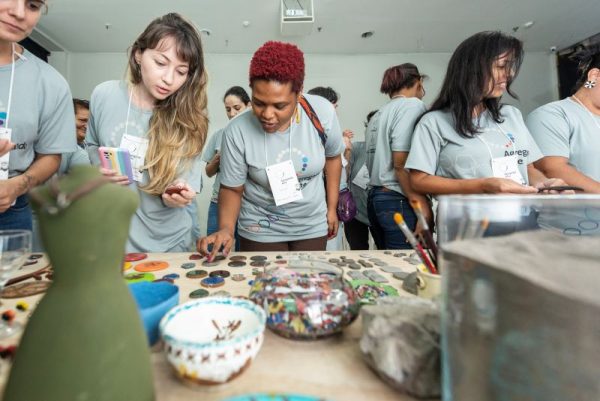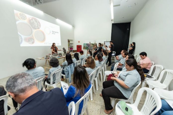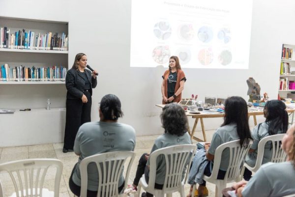 Uma nova jornada de aprendizado começou na tarde desta segunda-feira (17/07), no Centro Cultural Usiminas, para as 20 mulheres alunas do Projeto Agregando Arte. A iniciativa inédita promove um curso de formação que ensina a transformar o agregado siderúrgico, coproduto gerado na fabricação do aço, em tintas, biojóias, peças decorativas e brindes.