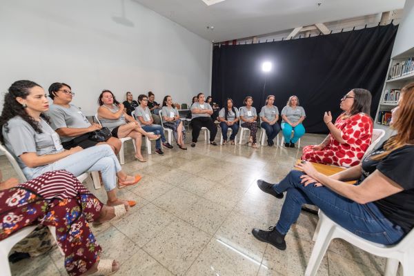 Assinando a curadoria da exposição do Agregando Arte, Mary compartilhou sua experiência e trajetória durante uma roda de conversa com as alunas do curso de formação do projeto, além de avaliar e direcionar as coleções criadas para a mostra.