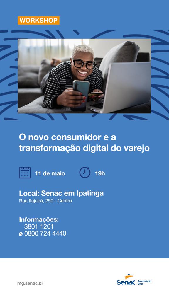 Na próxima quinta-feira (11), às 19h, o Senac em Ipatinga, localizado na Rua Itajubá, 250, irá oferecer o workshop gratuito “O novo consumidor e a transformação digital no varejo”. O docente Peterson Franco irá falar sobre o perfil do novo consumidor, como ele se comporta e como a tecnologia pode estar aliada a ele. Os interessados podem se inscrever pelo site.