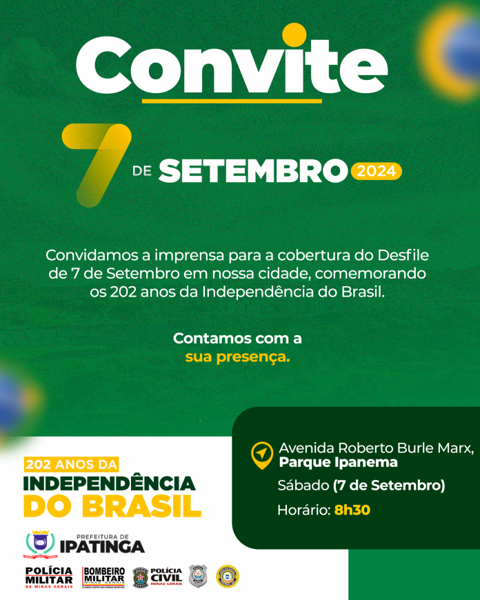 O Parque Ipanema, principal cartão-postal de Ipatinga, será mais uma vez palco do tradicional desfile de 7 de Setembro, reunindo escolas, entidades e instituições civis e militares, a partir das 8h30 do próximo sábado. Neste ano, no Dia da Pátria, é celebrado o 202º aniversário da Independência do Brasil.